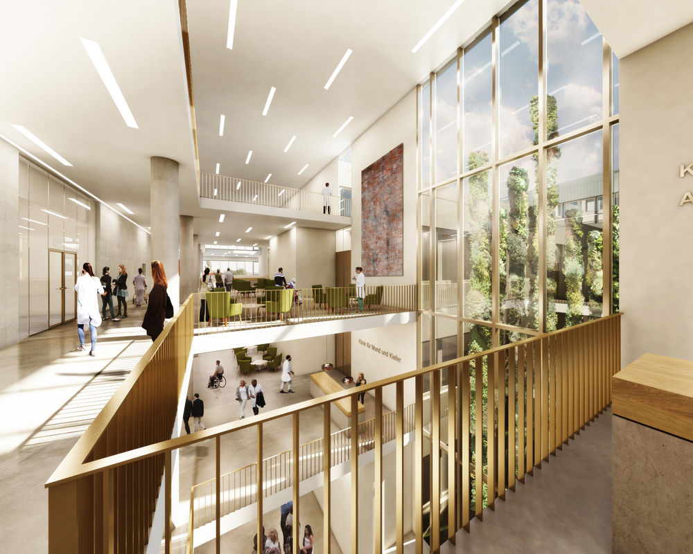 Dreiklang – Drei Dimensionen im Einklang. Gegliedert in die drei Nutzungsbereiche Ambulatorien, Funktionsbereiche und Bettenstationen, entstehen eigenständige, gut auffindbare Zonen. Aus deren Zusammenfügung resultiert wiederum ein einfacher und leicht begreifbarer Baukörper. Das Prinzip der kurzen Wege für Personal und Patienten garantiert eine medizinische Versorgung, die von Effizienz und einem Höchstmass an Flexibilität geprägt ist. Ambulante und stationäre Bereiche sowie deren Verkehrsströme werden durch einen zentralen Boulevard konsequent voneinander getrennt. Der viergeschossige Boulevard, Herzstück des Gebäudes, verbindet alle Bereiche und hilft Patienten, Besuchern und Mitarbeitenden bei der Orientierung. Offen geführte Verbindungstreppen und Lichthöfe verstärken die Vernetzung der einzelnen Abteilungen zusätzlich.