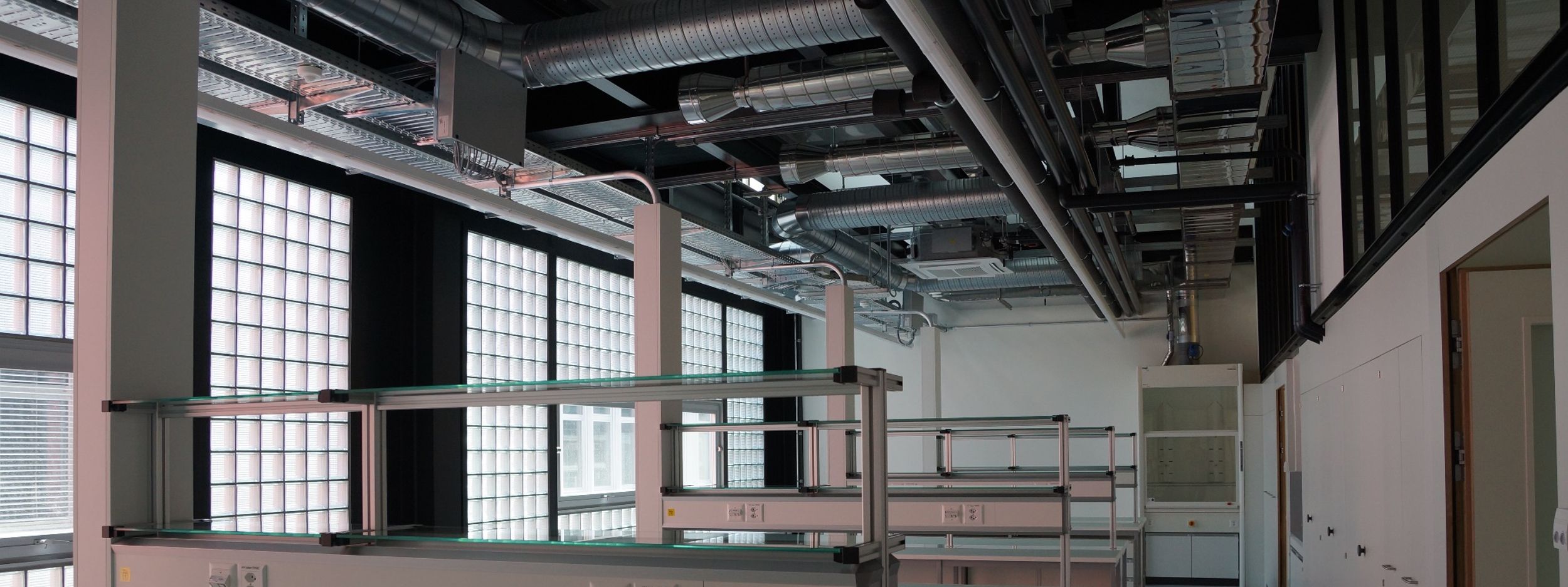 Die Kühlung der Laborräume erfolgt grösstenteils über Umluftkühler und additiv über die Lüftungsanlage. Um Zugserscheinungen maximal möglich zu unterbinden wurden die ULK's in ca. 4.0m Höhe im bestehenden Stahlbau integriert. Durch diese können die nutzungsbedingten hohen spezifischen internen + externen Wärmelasten anwendungseffizient und mit möglichst hohem Komfort abgeführt werden.