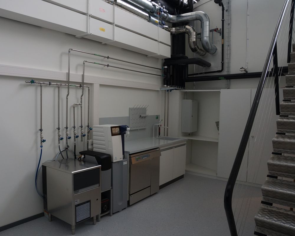 Die Versorgung von Kalt + Warmwasser erfolgt über eine neue Sanitärzentrale. Diese wird ab der bestehenden Feuerlöschleitung erschlossen. Durch den Neuanschluss, wird die bis vor dem Umbau schlecht durchströmte Feuerlöschleitung, fachgerecht durchspült. Für die zentrale Laborspülküche wurde eine eigene Enthärtungs- / Osmose- und Reinstwasseraufbereitung installiert. Gewisse Laborräume können aus nutzerspezifischen Gründen der darunterliegenden Räume nicht frei entwässert werden. Entsprechend werden die Laborspültische mit Kompakthebeanlagen in die hochliegende Sammelleitung entwässert.