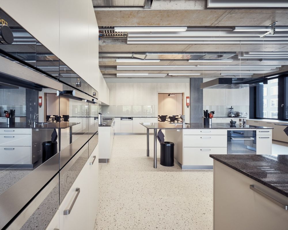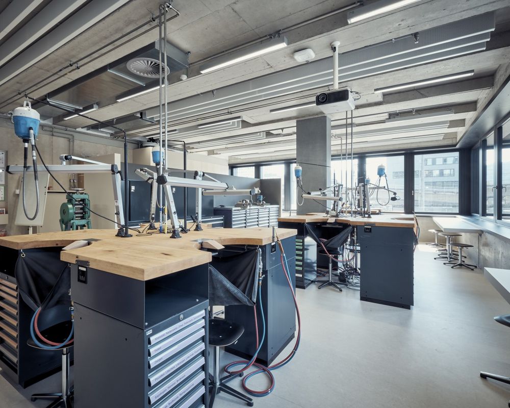 Die Zuluft ist im Sommer teilklimatisiert, was höchste Behaglichkeit garantiert. Die Luftmengensteuerung erfolgt bedarfsgerecht über Luftqualitätsfühler. Um in den Korridoren möglichst grosse Raumhöhen zu gewährleisten, wurden die meisten Zimmer nur mit Zuluft erschlossen, die Abluft strömt über speziell auf das Projekt dimensionierte Schalldämpfer zu den zentralen Abluftfassungen an den Korridorenden. So kann die Luft mehrfach genuzt werden und zudem werden weniger Installationen verbaut. Da die Rohbaustruktur bereits erstellt und Fortluftanlagen über das 80m höher gelegene Dach nicht realisierbar waren, wurde im Bereich des Schweissarbeitsplatzes in der Schmuckbearbeitung eine Umluftreinigungsanlage erstellt.
